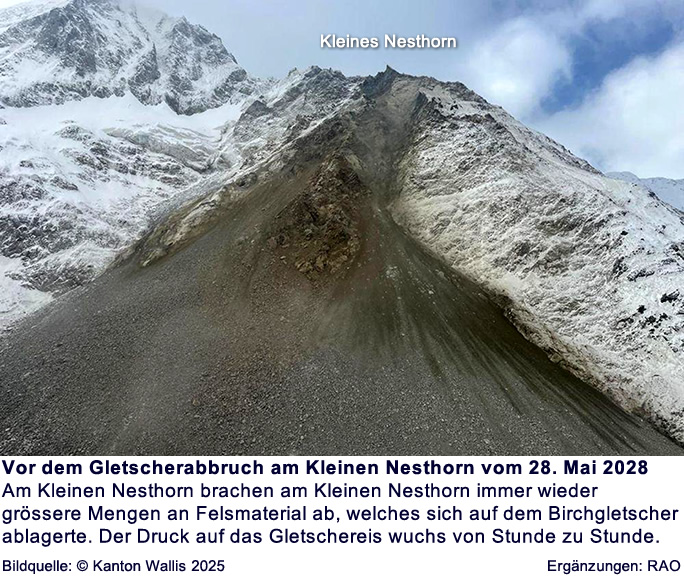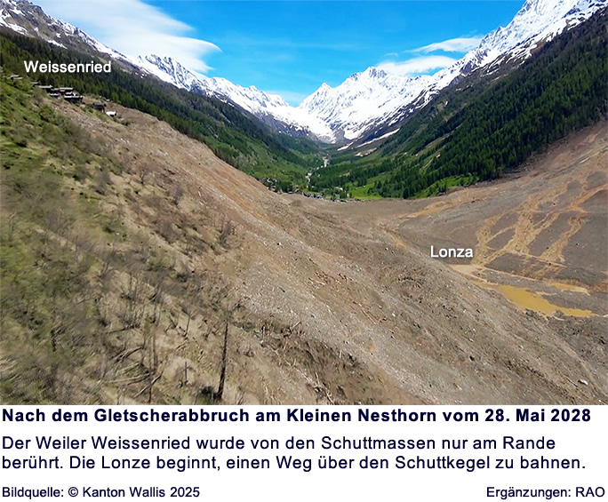 Am Kleinen Nesthorn bestehen weiterhin erhebliche Instabilitäten - betroffen sind mehrere Hunderttausend Kubikmeter Fels. Auch auf der anderen Talseiten besteht die Gefahr von Murgängen. Auch das im Talboden gelegene Absturzmaterial aus Felsen, Eis und Wasser ist nicht stabil und Murgänge sind auch innerhalb dieser Ablagerung möglich. Dies macht zum jetzigen Zeitpunkt jegliche Intervention im Katastrophe unmöglich. Zur Krisenbewältigung hat das kantonale Führungsorgan neben den vorhandenen Einsatzmitteln zusätzliche Ressourcen mobilisiert. ihrerseits hat eine erste Lagebeurteilung vor Ort zwecks konkreter Bedarfsabklärung durchgeführt. Bereits am Vortag hatte das KFO Hilfsmassnahmen in Form von Pumpen, Räumfahrzeugen, Trümmerabtransport sowie Beleuchtungsmasten angefordert. Der Zivilschutz bietet Unterstützung und auch Fachingenieurbüros wurden hinzugezogen. Die Kantonsstrasse von Goppenstein in Richtung Blatten bleibt bis auf Weiteres für den gesamten Verkehr gesperrt, ausgenomme sind Anwohner und Einsatzfahrzeuge. Die Bevölkerung wird dringend aufgefordert, den Anweisungen der Behörden strikt Folge zu leisten und das betroffene Gebiet nicht zu betreten. Das kantonale Führungsorgan analysiert die Lage laufend. Der Kanton Wallis wird alle verfügbaren Mittel einsetzen, um die von d dramatischen Ereignis betroffene Bevölkerung bestmöglich zu unterstützen. 29. Mai 2025, 17:30 Uhr Der See, der sich durch die Ablagerung des abgebrochenen Birchgletschers sowie durch das Material der Felstürze am Kleinen Nesthorn gebildet hat, füllt sich rasch. Ein Überlaufen der Lonza über den Schuttkegel könnte sich im Verlauf der Nacht ereignen. Im schlimmsten Fall könnten dadurch Murgänge ausgelöst werden. Der regionale Führungsstab und die Einsatzkräfte von Gampel-Steg hält sich vorsorglich bereit für eine Evakuierung der Bevölkerung. Einige Gebäude im Lötschental wurden ebenfalls bereits evakuiert. Der Grossteil des Birchgletschers oberhalb von Blatten sowie der darüber liegende Schuttkegel sind eingebrochen. Am Talgrund hat die dadurch entstandene, mehrere Dutzend Meter dicke und rund zwei Kilometer lange Eis-und Gesteinsmasse einen erheblichen Teil des Dorfes Blatten verschüttet. Der Flusslauf der Lonza wurde blockiert, und der dadurch oberhalb des Absturzmaterials entstandene See mit einem Volumen von rund drei Millionen Kubikmetern füllt sich rasch. Ein Überlauf der Lonza über die Geröllablagerung könnte im Laufe der Nacht erfolgen, was zu Murgängen führen könnte. Der regionale Führungsstab und die Einsatzkräfte von Gampel-Steg hält sich vorsorglich bereit, die Bevölkerung zu evakuieren. Einige Gebäude im Lötschental wurden ebenfalls bereits evakuiert. Darüber hinaus wurde die Speicherkapazität des weiter talwärts gelegenen Stauwerks bei Ferden erhöht. Aufgrund der bestehenden Risiken und der geologischen Instabilität ist derzeit jeglicher Einsatz im Katastrophengebiet unmöglich. Die Armee steht bereit, um mit Wasserpumpen, Baggern und weiteren schweren Räumgeräten sowie Beleuchtungsmaterial einzugreifen. Auch der Zivilschutz ist mobilisiert. Die Bevölkerung wird dringend aufgefordert, den Anweisungen der Behörden strikt Folge zu leisten und das betroffene Gebiet nicht zu betreten. Die Kantonsstrasse von Goppenstein in Richtung Blatten bleibt bis auf Weiteres für den gesamten Verkehr gesperrt, ausgenommen sind Anwohner und Einsatzfahrzeuge. Das kantonale Führungsorgan analysiert die Lage laufend.
