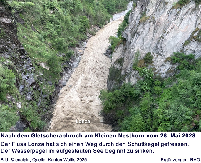 2. Juni 2025 Die Lonza, die sich oberhalb des Schuttkegels angestaut hat, fliesst seit Freitag über die gesamte Länge des Kegels ab. Da die Sedimentbelastung des ablaufenden Wassers sehr hoch ist, kann dieses von den Turbinen des Stausees Ferden nicht mehr turbiniert werden. Der Grundablass des Stausees wurde am Freitagabend teilweise geöffnet, damit das Wasser vom See in den darunterliegenden Fluss abfliessen kann. Der Pegel des Sees von Ferden ist wieder leicht gestiegen und liegt etwas über dem gemessenen Stand vor der Öffnung des Grundablasses. Die Lage wird jedoch als unter Kontrolle und stabil eingeschätzt und damit bleibt die Rückhaltefunktion des Sees im Falle eines Murgangs erhalten. Ein Einsatz auf dem Schuttkegel ist derzeit aber noch immer nicht möglich. Die Lage wird vom kantonalen Führungsorgan im engen Austausch mit den verantwortlichen regionalen Führungsstäben und dem Kraftwerkbetreiber laufend beurteilt. Die Bevölkerung wird aufgefordert, den Anweisungen der Behörden strikt Folge zu leisten. Die Lonza fliesst mittlerweile über die gesamte Länge des Schuttkegels ab und auf der Ablagerung bilden sich kleine Seen. Der Fluss füllt den vorsorglich entleerten Stausee in Ferden erneut auf. Da die Konzentration der Ablagerungen im Wasser zu hoch ist, kann nicht turbiniert werden. In Anbetracht dieser Situation wurde am Freitagabend der Grundablass des Stausees teilweise geöffnet. Diese kontrollierte Massnahme ermöglicht den Abfluss des Wassers vom Stausee in die Lonza. Der Pegel des Sees von Ferden ist leicht gestiegen, liegt etwas über dem gemessen Stand vor der Öffnung des Grundablasses. weiterhin unteretwas über dem gemessenen Stand vor der Öffnung des Grundablasses. Die Lage wird jedoch als unter Kontrolle und stabil eingeschätzt. Die Rückhaltefunktion des Sees im Falle eines Murgangs bleibt damit erhalten. Der Pegelstand des Sees, der sich oberhalb des Schuttkegels von Blatten angestaut hat, ist aktuell stabil. Die betroffene Zone sowie der See, der Fluss und der Stausee Ferden werden laufend überwacht. Zu diesem Zweck wurden zahlreiche Messgeräte installiert. Die Gefahr im Bergsturzgebiet bleibt allerdings sehr hoch. Am Kleinen Nesthorn wird erneut eine sehr hohe Aktivität registriert; laut Einschätzungen sind noch immer mehrere hunderttausend Kubikmeter Fels instabil. In der Mulde des Birch-Gletschers bildet sich ein kleiner See. Der Korridor oberhalb des Gletschers fasst etwa 300'000 m3 und es könnten Murgänge in diesem Couloir auftreten. Ein Einsatz auf dem Schuttkegel ist deshalb derzeit nicht möglich. Die Bevölkerung wird dringend aufgefordert, den Anweisungen der Behörden Folge zu leisten. Die Lage wird vom kantonalen Führungsorgan im engen Austausch mit den verantwortlichen regionalen Führungsstäben und dem Kraftwerkbetreiber laufend beurteilt.