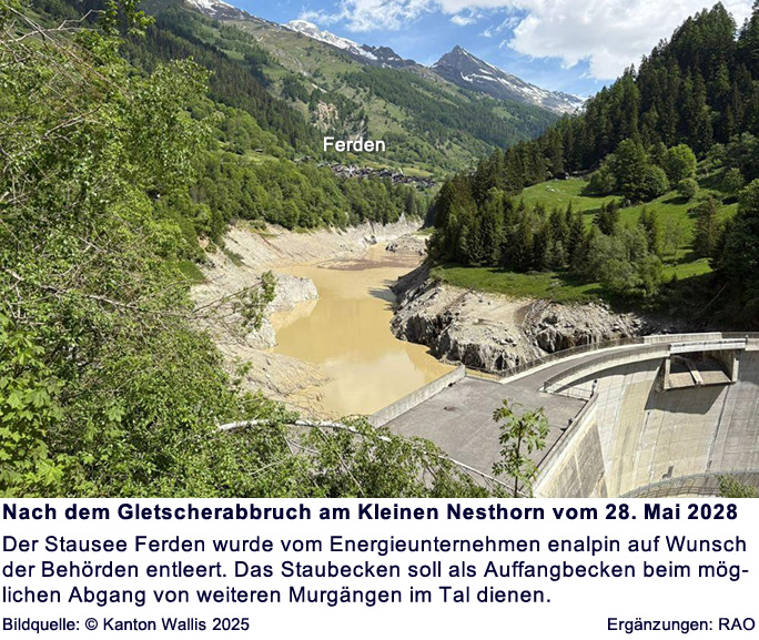 31. Mai 2025, 11:15 Uhr Die Lonza, die sich oberhalb des Schuttkegels angestaut hat, fliesst seit gestern über die gesamte Länge des Kegels ab. Da die Sedimentbelastung des ablaufenden Wassers sehr hoch ist, kann dieses von den Turbinen des Stausees Ferden nicht mehr turbiniert werden. Der Grundablass des Stausees wurde am Freitagabend teilweise geöffnet, damit das Wasser vom See weiterhin in den darunter liegenden Fluss abfliessen kann. Dies erlaubte es, den Seespiegel während der Nacht zu stabilisieren, was in Zusammenhang mit der Rückhaltefunktion des Sees bei allfälligen Murgängen sehr wichtig ist. Tendenziell scheint der angestaute See oberhalb des Schuttkegels leicht zu sinken. Die Lage wird vom kantonalen Führungsorgan im engen Austausch mit den verantwortlichen regionalen Führungsstäben und dem Kraftwerkbetreiber aber weiterhin laufend beurteilt. Die Bevölkerung wird aufgefordert, den Anweisungen der Behörden strikt Folge zu leisten. Die Lonza, die mittlerweile über die gesamte Länge des Schuttkegels abfliesst, füllt den vorsorglich entleerten Stausee in Ferden erneut auf. Da die Sedimentkonzentration im Wasser zu hoch ist, ist ein Turbinieren nicht möglich. In Anbetracht dieser Situation wurde am Freitagabend der Grundablass des Stausees von Ferden teilweise geöffnet. Diese kontrollierte Massnahme ermöglicht den Abfluss des Wassers vom Stausee in die Lonza und erlaubte es, den Pegel des Stausees die Nacht über zu stabilisieren, was in Zusammenhang mit der Rückhaltefunktion des Sees bei allfälligen Murgängen wichtig ist. Tendenziell scheint der Pegel des angestauten Sees oberhalb des Schuttkegels leicht zu sinken. Die betroffene Zone sowie der See, der Fluss und der Stausee Ferden werden laufend überwacht. Zu diesem Zweck wurden zahlreiche Messgeräte installiert. Die Gefahr im Katastrophengebiet bleibt sehr hoch, weshalb ein direkter Einsatz der Einsatzkräfte vor Ort weiterhin nicht möglich ist. Die Bevölkerung wird dringend aufgefordert, den Anweisungen der Behörden Folge zu leisten. Die Lage wird vom kantonalen Führungsorgan im engen Austausch mit den verantwortlichen regionalen Führungsstäben und dem Kraftwerkbetreiber laufend beurteilt.