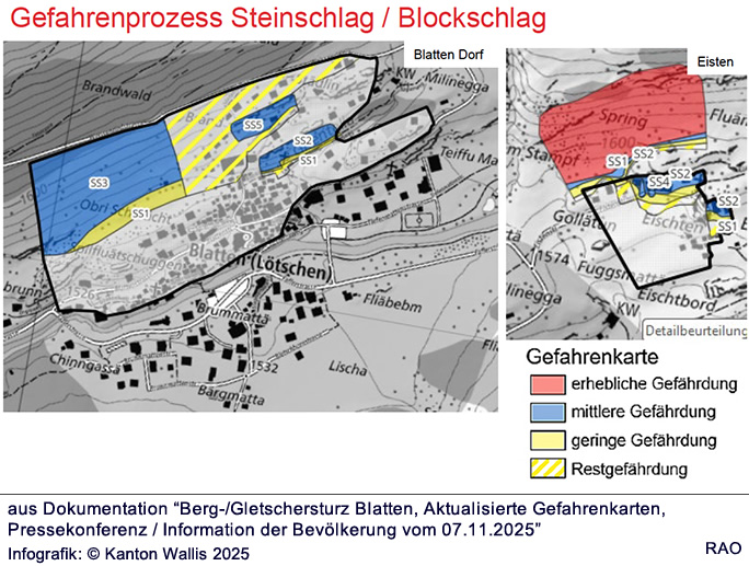 Der Bergsturz vom 28. Mai 2025 hat die Situation in Bezug auf Naturgefahren im Siedlungsgebiet der Gemeinde Blatten und insbesondere beim ehemaligen Dorfkern und am Ried grundlegend verändert. Aufgrund dieser Veränderungen hat die Gemeinde Blatten die Revision ihrer Naturgefahrenkarten in Auftrag gegeben. Diese wurden von spezialisierten Büros in Zusammenarbeit mit den Fachstellen des Kantons sowie Vertretern der Gemeinde erarbeitet. Die Dienststelle Naturgefahren hat diese nun formell validiert. Auf Grundlage der revidierten Gefahrenkarten kann die Gemeinde Blatten beginnen, ihre Nutzungsplanung zu überarbeiten.