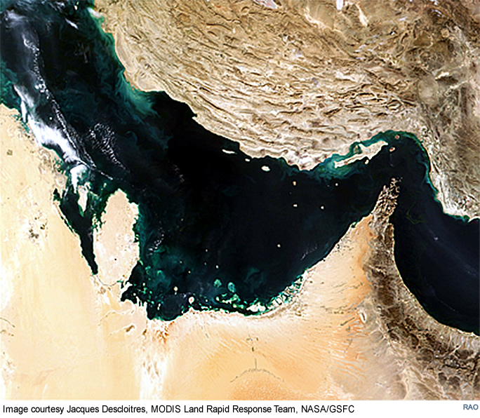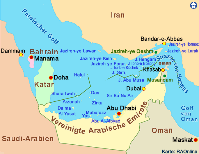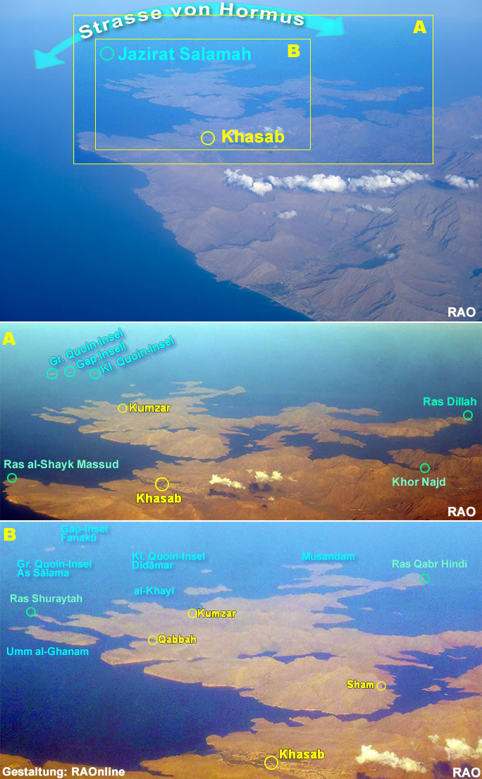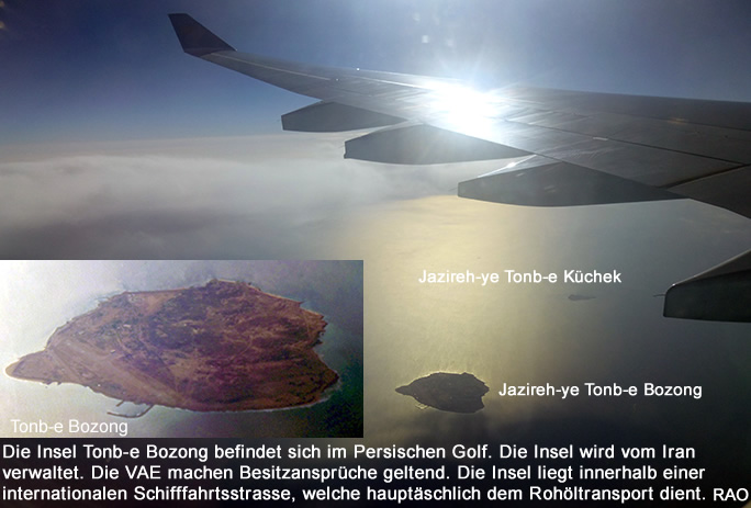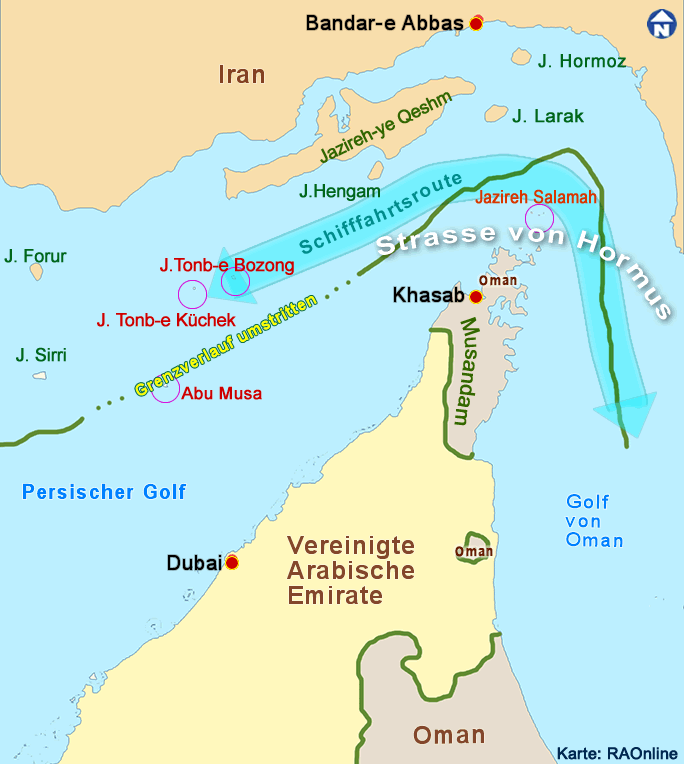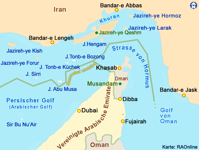 Weiter westlich von Musandam verläuft der Seeweg im Persischen Golf an einigen iranischen Inseln vorbei. Schiffe, welche nach der Passage des Golfs von Hormus in Richtung der Häfen entlang der Küste der Vereinigten Arabischen Emiraten VAE weiterfahren, müssen vorerst Meeresflächen durchqueren, in welcher der Verlauf der Staatsgrenze zwischen den VAE und dem Iran umstritten ist. Die Hoheitsrechte über die Insel Abu Musa sowie der beiden weiter nördlich liegenden Tonb-Inseln werden sowohl von den VAE wie auch vom Iran beansprucht. Der Iran hat vor einiger Zeit diese Inseln militärisch besetzt.