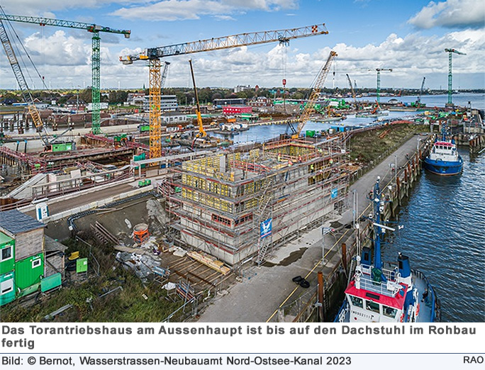 Beim Bau der 5. Schleusenkammer in Brunsbüttel wurden im Jahr 2023 wichtige Etappenziele erreicht und gute Fortschritte erzielt. Mitte November begann trotz ungünstiger Witterungsbedingungen wie Sturm und Frost die planmässige Betonierung des ersten Abschnitts der Unterwasserbetonsohle der Schleusenkammer.