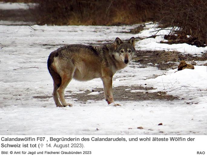 Die wohl älteste Wölfin der Schweiz ist tot. Die Fähe F07, Begründerin des Calandarudels, musste am Montagabend in der Nähe von Haldenstein aufgrund ihres körperlich schlechten Zustands und fehlender Fluchtreaktionen durch die Wildhut erlegt werden. Das Alter des Tieres wird auf 13 bis 14 Jahre geschätzt. Im Juni 2011 konnten erste Spuren von F07 im Oberwallis nachgewiesen werden. Seit Herbst 2011 lebte die Wölfin im Kanton Graubünden.