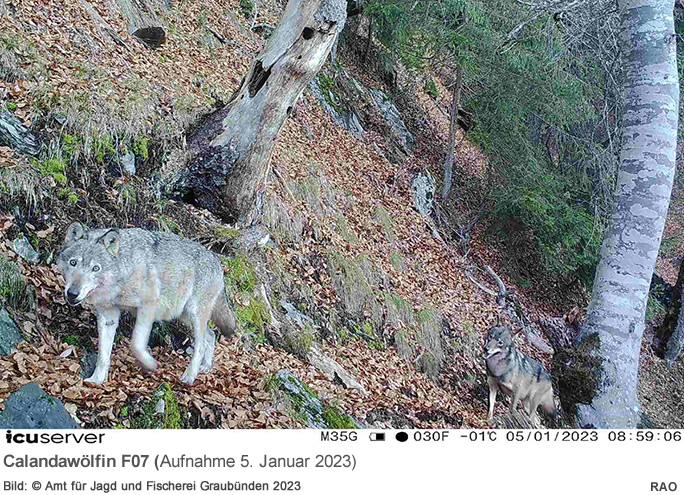 Auf dem neusten Fotofallenbild des Kantons Graubünden ist sie wiederum mit einem anderen Wolf zu sehen. Gut möglich, dass das aktuelle Bild eines der letzten sein wird. Alte Wölfe verzeichnen irgendwann auf Grund von körperlichem Zerfall keinen Jagderfolg mehr und sterben. Sollte der Kadaver gefunden werden, ist es wichtig, umgehend den örtlichen Wildhüter des Amtes für Jagd und Fischerei zu benachrichtigen.