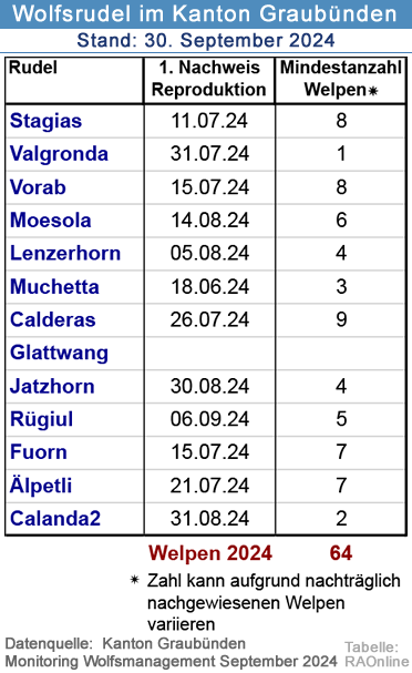 Aktuell leben mindestens dreizehn Rudel auf dem Kantonsgebiet. Zum Vergleich ist der letzte Quartalsbericht (2. Quartal des Kalenderjahres 2024) unter folgendem Link aufzurufen (Quartalsbericht 2/2024 auf www.wolf.gr.ch).