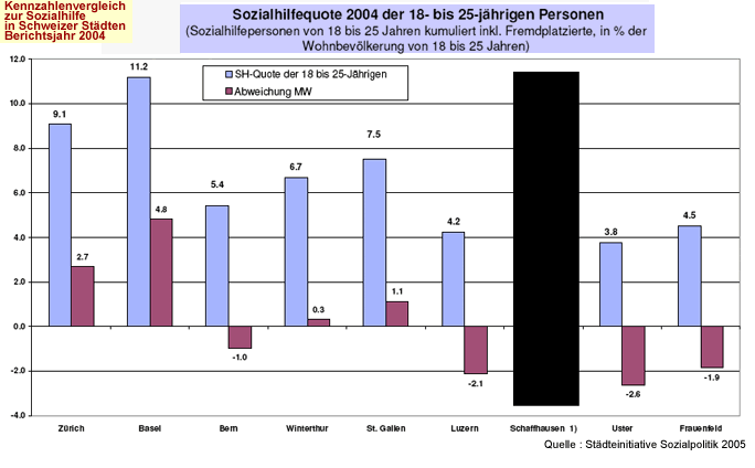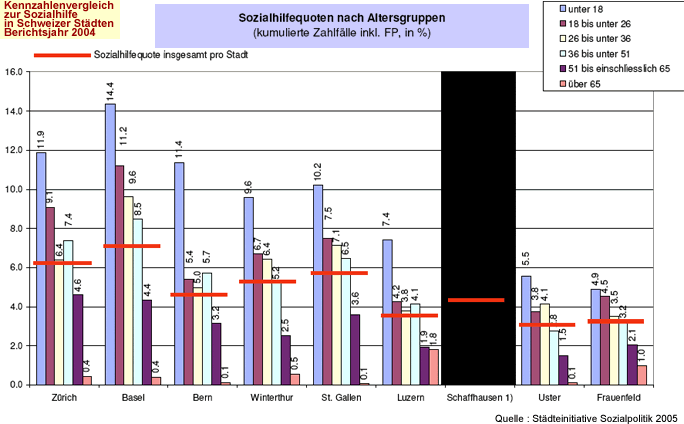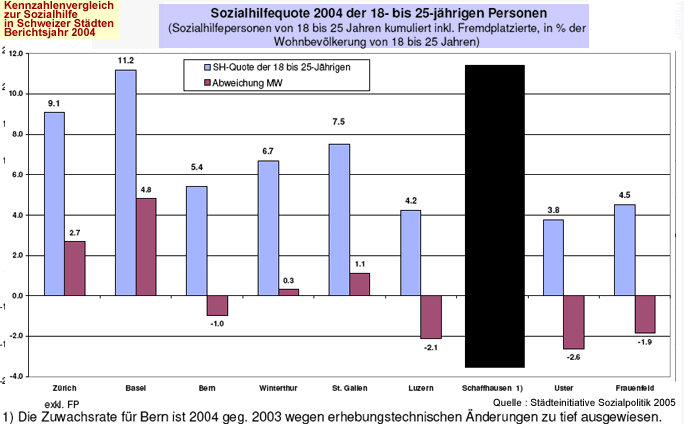 diese Probleme an der Wurzel zu bekämpfen. In der Sozialhilfe - dem letzten Netz der sozialen Sicherheit - werden die verpassten Chancen dann jedoch sichtbar und führen zur politischen Diskussion, insbesondere wenn ihr Anteil in der Sozialhilfe zunehmend wächst. Oft haben aber die Heranwachsenden dann bereits eine lange Reihe von schlechten Erfahrungen gemacht; sie sind mut- und hoffnungslos und häufig bereits schwer zu bewegen, etwas zu verändern. Die besagten Desintegrationsprozesse sind bereits in vollem Gange und die überschuldung oft schon da. Die Desintegration eines erheblichen Teils der jungen Generation kommt die Gesellschaft aber auf die Dauer ausserordentlich teuer zu stehen. Die Sozialhilfequote der jungen Erwachsenen ist nicht nur hoch, sondern in den letzten Jahren in vielen Städten recht deutlich gestiegen - so vor allem in Zürich, Basel, Winterthur, St. Gallen und Frauenfeld. Die