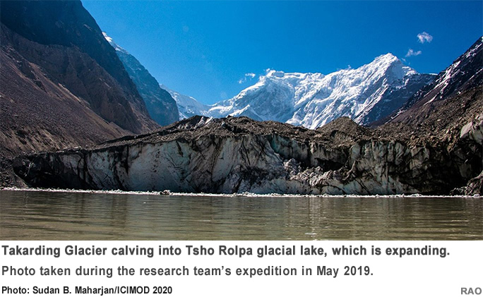 remote-sens-spatial-inf-sci.net/V-3-2020/633/2020/) that combines remote-sensing data with !eld validation to remotely monitor the expansion of Tsho Rolpa glacial lake, a potentially dangerous glacial lake in the Koshi basin. Data generated by remote sensing showed that the lake is expanding towards Takarding Glacier, and this was validated by an expedition team which observed the glacier ice calving into the lake. This new approach could be adopted to monitor lakes across basins.