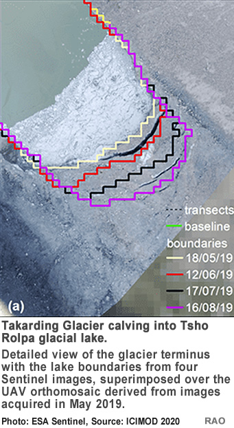 The WeACT research team used satellite images with a high spatial and temporal resolution to study Tsho Rolpa's boundary variations for the summer of 2019. The researchers used Copernicus Sentinel multispectral imagery to extract more accurate lake boundaries at a 10-m spatial resolution. Preliminary results estimated the lake's boundary changes and the glacier terminus horizontal position through time. The team validated the results through unmanned aerial vehicle-based photogrammetry, with information from the !eld-based ground control point using a di$erential global positioning system device. The team also compared their observations with previous estimations to !nd that the lake has been gradually expanding.