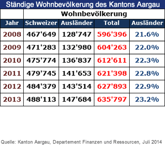 Am 31. Dezember 2013 zählte der Kanton Aargau 635'797 Einwohnerinnen und Einwohner. |