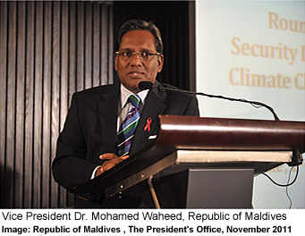 | Vice President Dr. Mohamed Waheed has said that regional collaboration is crucial to key developments in security risks related to adverse and unusual affects caused by climate change within the South Asian region. The Vice President made this statement while speaking at "Security Implications of Climate Change" held by South Asia Network for Security and Climate Change (SANSaC) at Trader's Hotel, Malé, Maldives.