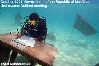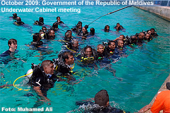 President Mohamed Nasheed, Vice President Dr Mohamed Waheed and 11 cabinet ministers donned scuba gear and submerged 4 meters below the surface of sea to hold the world's first underwater cabinet meeting, in a bid to push for a stronger climate change agreement in the upcoming climate summit in Copenhagen.