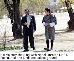 Dr Pachauri, who sits on the economic advisory council of the prime minister of India, besides teaching in several universities worldwide, received an audience with His Majesty the King and met the prime minister. Lyonchhoen Jigme Y Thinley and Dr Pachauri yesterday discussed a wide range of climate and environmental issues, which confront Bhutan and the South Asian nations.
