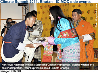 Her Royal Highness also presented awards and certificates to the winners of a poster competition, 'Your Expression about Climate Change', organised by ICIMOD and Lungtenzampa Middle Secondary School (LMSS), Thimphu on 2 September 2011. The competition focused on the four themes of the Bhutan Climate Summit - water, food security, biodiversity, and energy.