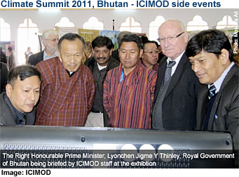| The Right Honourable Prime Minister, Lyonchen Jigme Y Thinley, Royal Government of Bhutan inaugurated an exhibition of posters, demonstrations, and online applications from 17 to 19 November which showcases key Earth observation applications addressing climate change in the eastern Himalayan region, with a particular focus on Bhutan. The exhibit is presented in conjunction with the two-day International Symposium 'Connecting from Space to Village: Enabling Climate Change Policy and Actions in the Himalayas’ in Thimphu. |