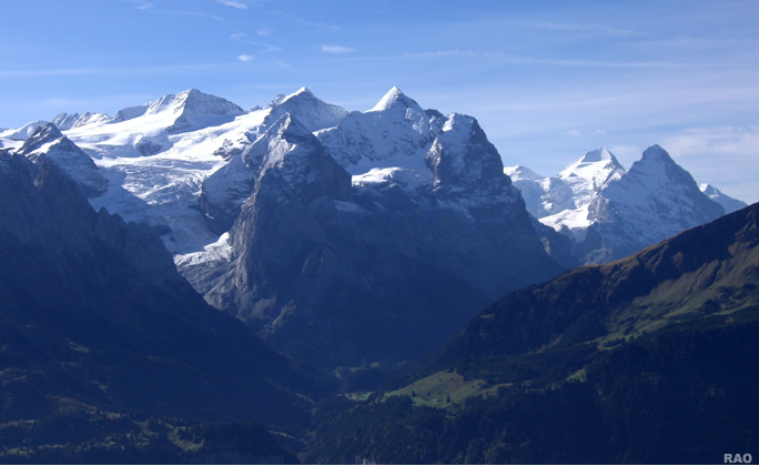 Berner Oberland: Rosenlaui, Wetterhorn, Mönch und Eiger (Ausblick , Aufnahmeort: Hasliberg BE)