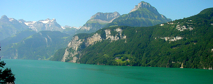 links: Uri-Rotstock (mit Schnee), Oberbauenstock (in der Mitte) und rechts daneben der Niderbauenstock