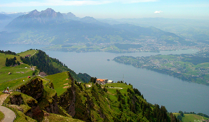 Rigi Staffel mit Vierwaldstättersee und Pilatus (left background) und the City of Lucerne (center right) - Ausblick , Aufnahmeort: Rigi Kulm