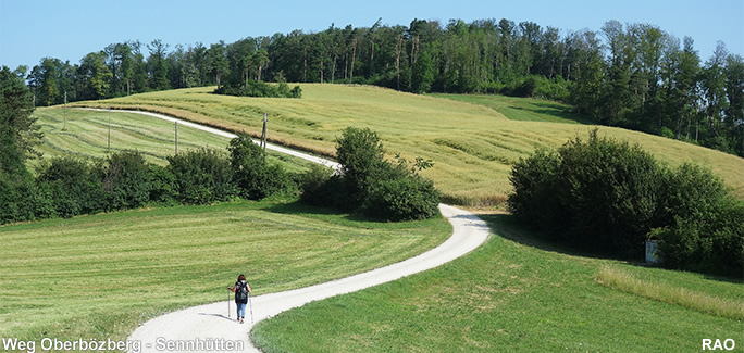 1. Variante: Der kürzeste Weg führt in rund 40 Min. auf dem normalen Wanderweg (gelbe Wegweiser) zur Sennhütte. Der Weg auf dem offiziellen Wanderweg folgt im mittleren Abschnitt einer geteerten öffentlichen Fahrstrasse. Auf dem ersten (mit Fahrverbot) und letzten Abschnitt (ohne Fahrverbot) ist die Fahrstrasse ohne Teerbelag. Der Weg von Oberbözberg über die Sennhütten auf die Ampfernhöhe ist auch bei den Velofahrern beliebt.