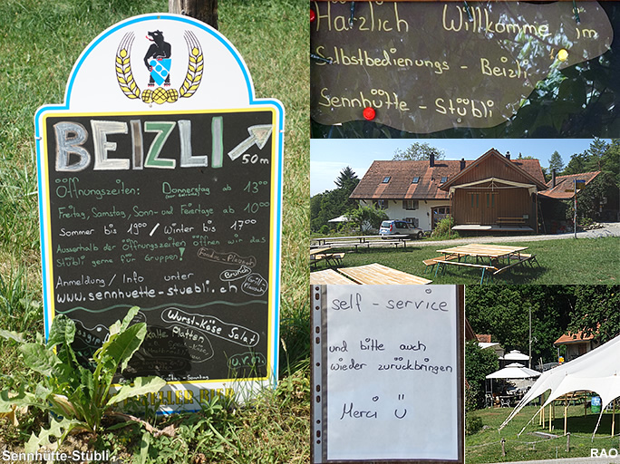 | Die Sennhütte wurde vom Besitzer-Ehepaar zu einem Ort der Begegnung und zu einer "Wohlfühl-Oase" mit Besen-Beizli, Feuerstelle und Kinderspielplatz entwickelt. Das Künstlerpaar organisiert auch kulturelle Anlässe. Es ist beeindruckend, wie in und um die Sennhütte aus privater Initiative ein Ort entstanden ist, welcher sich nicht mit Zäunen und Hägen abgrenzt, sondern einer breiteren Öffentlichkeit zu einer sorgsamen Nutzung überlassen wird. |