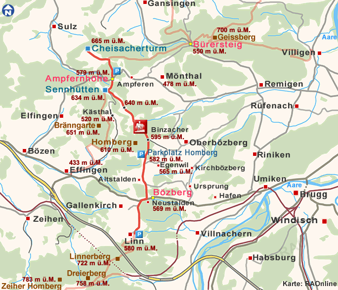 Von Linn aus führt der Wanderweg über Widacher (572 m ü. M., 10 Min. Marschzeit) und Neustalden (569 m ü. M.) zum Parkplatz Homberg (582 m ü. M.).