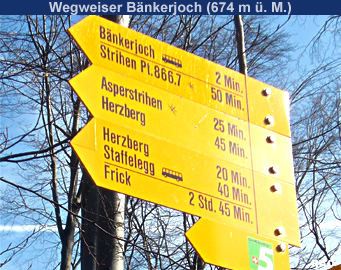 Nach Norden folgt der Wanderweg vorerst rund hundert Meter der Benkerjochstrasse und zweigt dann nach Osten ab. Kurz darauf eine weitere Wegverzweigung. Geradeaus führt der Weg ostwärts zum Herzberg und weiter zur Staffelegg. Nach links in Richtung Norden führt der Weg über die Stockmatt zum Strihe.