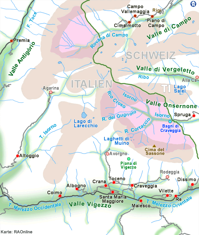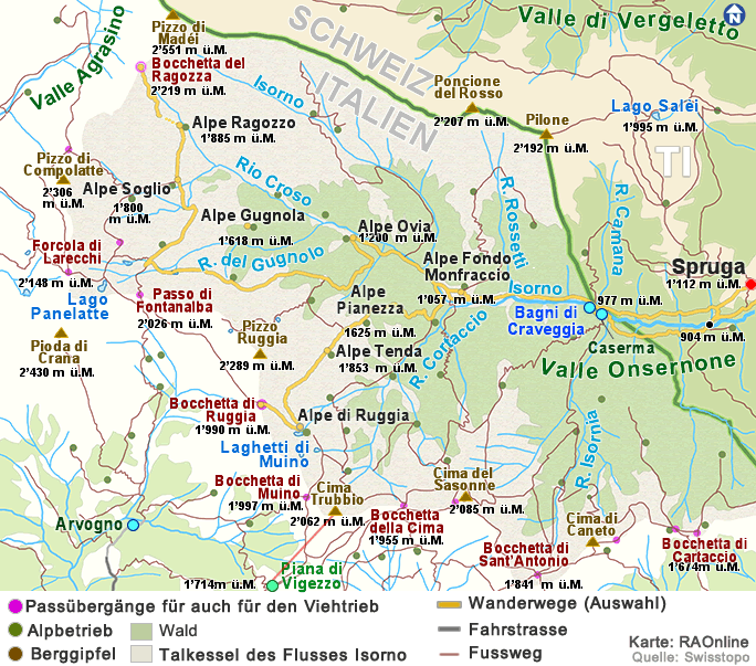 Wer vom Weiler Spruga aus auf der Fahrstrasse nach Westen in Richtung hinteres Onsernonetal, dem Quellgebiet des Flusses Isorno, wandert, trifft nach etwas mehr als einer halben Stunde Fussmarsch am Ende der Fahrstrasse auf die Grenze zu Italien. Das gesamte Quellgebiet liegt auf italienischem Staatsgebiet und gehört zur Gemeinde Craveggia, welche sich auf der anderen Seite der rund 2'000 m hohen Bergkette im Val Vigezzo befindet. Das Val Vigezzo ist die westliche Fortsetzung des schweizerischen Centovallitales in Italien.