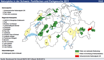 In der Schweiz gibt es somit nun 12 Pärke von nationaler Bedeutung, 7 Pärke in Errichtung sowie den Schweizerischen Nationalpark. Die Gesamtfläche beträgt rund 7300 Quadratkilometer, was ca. 18% der Schweizer Landesfläche oder gut der Fläche des Kantons Graubünden entspricht. Somit sind mehr als die Hälfte aller bisher eingereichten Parkprojekte in Betrieb.