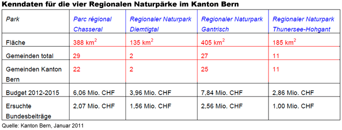 Am 7. Januar 2011 gingen beim Bundesamt für Umwelt BAFU in der vierten Eingaberunde seit 2008 neun Gesuche für Pärke von nationaler Bedeutung ein. Es handelte sich dabei um ein neues Gesuch des Kantons Tessin für globale Finanzhilfen zur Errichtung des Nationalparks Locarnese sowie um acht Gesuche um Verleihung des Parklabels für den Betrieb von Regionalen Naturpärken. Nach inhaltlicher Prüfung der Gesuche und Besichtigungen vor Ort steht fest, dass alle Gesuche die entsprechenden Anforderungen erfüllen.