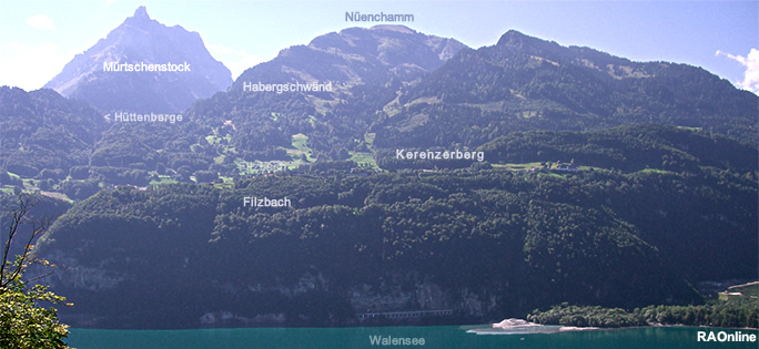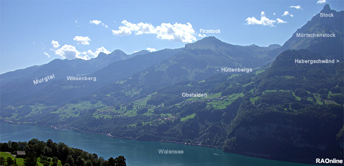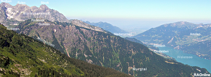 Von Merlen (1'089 m ü.M) aus marschiert man ins Mürtschental und weiter hinauf nach Unter Mürtschen (1'494 m ü.M), Mürtschen Fiz (1'616 m ü.M), und Robmen (1'750 m ü.M)am Fuss des Ruchen. |