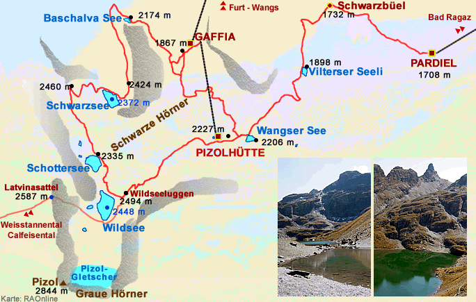 | Pizolhütte (2'227 m ü.M.) - Wangsersee - Wildseelücke (2'493 m ü.M.) - Wildsee (2'448 m ü.M.) - Schottensee (2335 m ü.M.) - Schwarzsee (2'372 m ü.M.) - Baschalvasee (2'174 m ü.M.) - Gaffia (1'867 m ü.M.) |