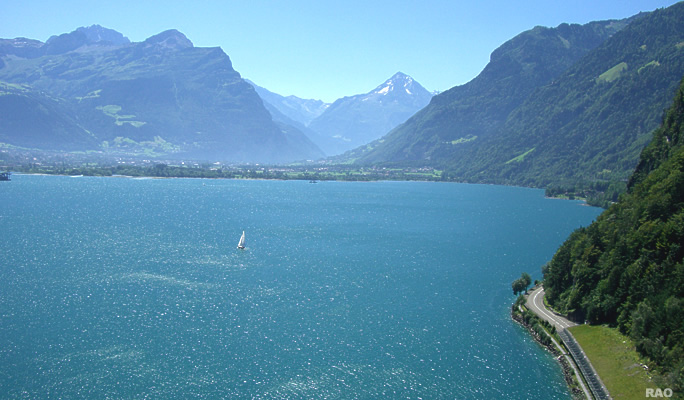 Urnersee Ostufer mit Fronalpstock, Rophaien, Eggberge(n) usw., Urner Reusstal mit Gr. Windgällen, Bristen usw. |