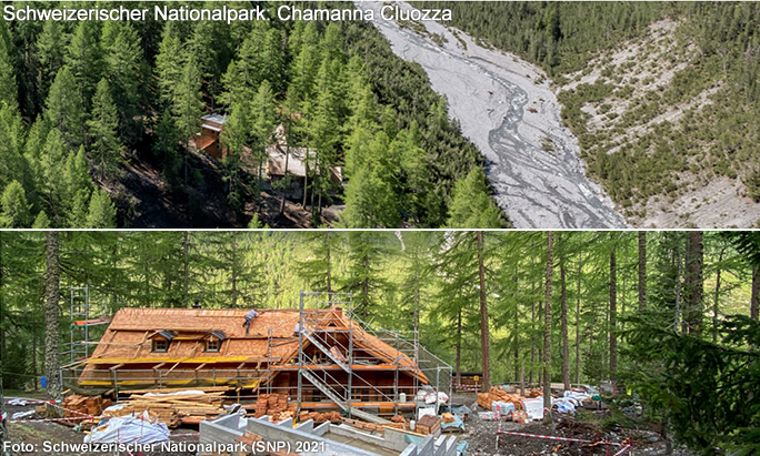 Die Ursprünge der Chamanna Cluozza im Schweizerischen Nationalpark (SNP) gehen auf das Jahr 1910 zurück. Über die Jahrzehnte wurde die Hütte immer wieder erweitert und bietet heute 58 Personen Platz. Der Holzstrick der ursprünglichen Hütte ist immer noch vorhanden und wird im Rahmen der noch bis Oktober dauernden Bauarbeiten teilweise wieder freigelegt. Ebenfalls an die ursprüngliche Hütte erinnern die von Hand gefertigten und genagelten Lärchenschindeln, die neu wieder das Dach des Hauptgebäudes zieren. Architekt Ramun Capaul nimmt in seinem Wettbewerbsprojekt die bestehenden Elemente sorgfältig auf und ergänzt das Ensemble mit einem separaten Wohnturm aus Lärchenholz, in welchem das Personal untergebracht wird. Der grösste Teil der Bauarbeiten konnte an einheimische Firmen vergeben werden.