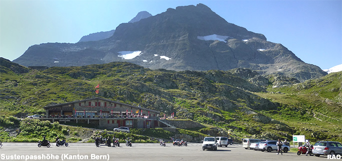| Auf der Sustenpasshöhe steht auf der Berner Seite vor dem Tunnelportal ein grosser Parkplatz (2'224 m ü.M.) zur Verfügung. Auf der anderen Strassenseite steht das Restaurant «Sustenpasshöhe».