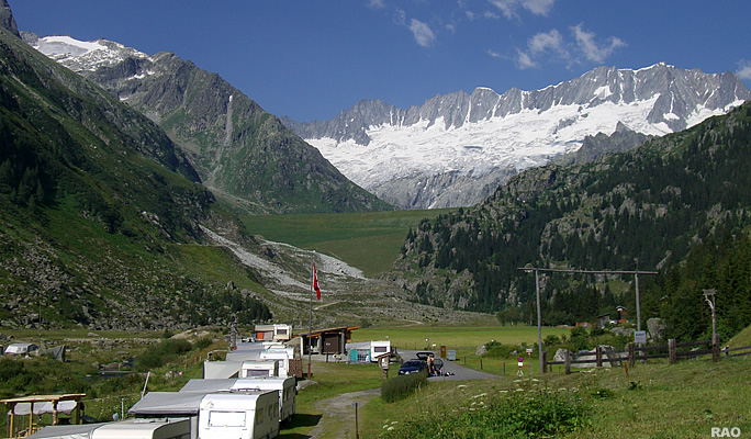Staumauer Göscheneralpsee mit Dammagletscher, Campingplatz