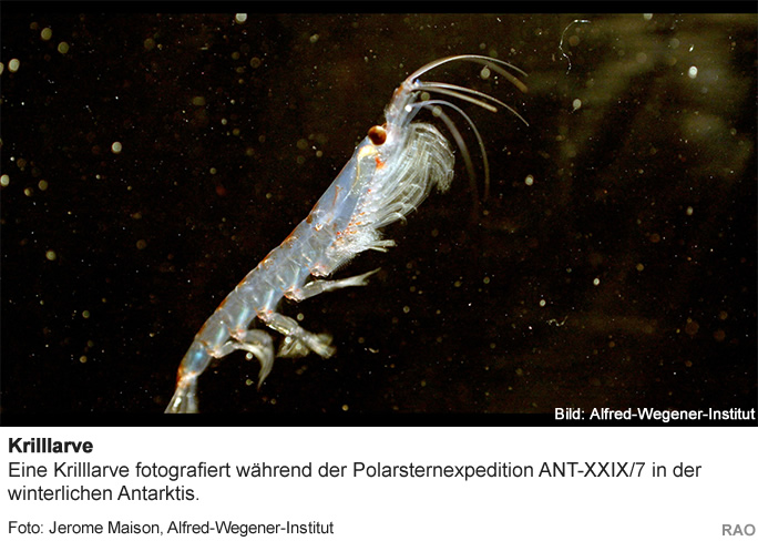 Etwa fünf Zentimeter lang, rötlich, garnelenartige Figur: Auf den ersten Blick gehört der Antarktische Krill Euphausia superba sicher nicht zu den eindrucksvollsten Bewohnern des Südpolarmeers. Doch der unscheinbare Krebs ist eine Schlüsselfigur im dortigen Ökosystem. Schliesslich liefert er die Nahrungsgrundlage für zahllose andere Tiere von Fischen, Pinguinen und Seevögeln bis hin zu Robben und Walen.