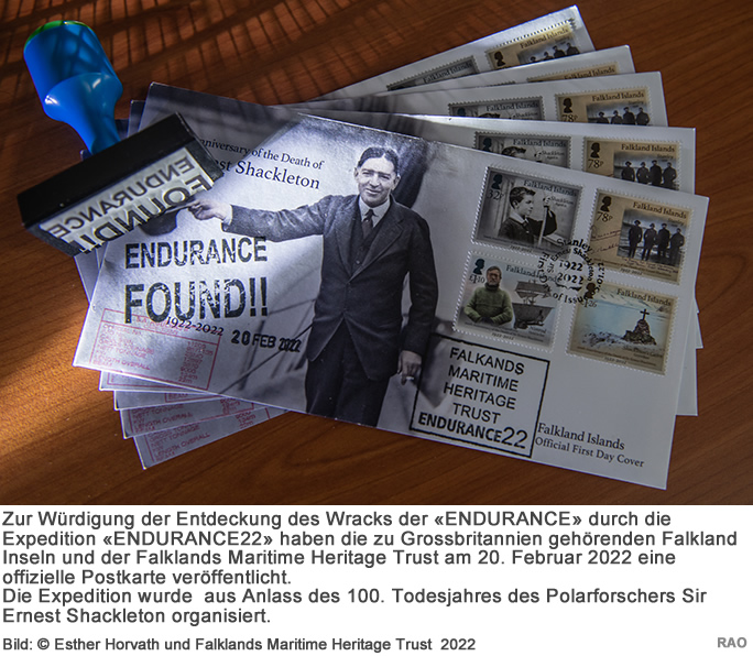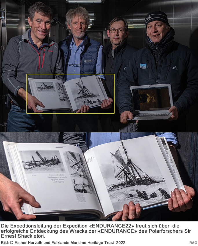 Die vom Falklands Maritime Heritage Trust unterstützte Expedition «Endurance22» hat das Wrack des Segelschiffs «Endurance» des Polarforschers Sir Ernest Shackleton in den Tiefen der antarktischen Weddell-Meeres aufgespürt. Ein Tauchroboter, welcher vom südafrikanischen Polarforschungs- und Versorgungsschiff «S.A. Agulhas II» ausgesetzt wurde, hat das 1915 vom Packeis beschädigte und danach gesunkene Forschungsschiff «Endurance» in 3'080 m Tiefe entdeckt. Die Fundstelle lag im Bereich, welches das Expeditionsteam vor seiner Abfahrt im Hafen von Kapstadt (Südafrika) festglegt hatte. Das Schiffswrack liegt heute ungefähr 4 Meilen (ca. 6,5 km) südlich der von Shackletons damals geretteten Schiffsführer und letztem Begleiter, Kapitän Frank Worsley, bezeichneten Stelle.