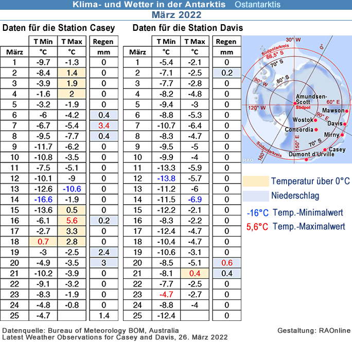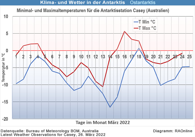 Für Casey wurden keine Temperaturrekorde registriert. Rekordhohe Luffttemperaturen wurden mit -17,7°C in der russischen Wostok-Station im Inland und mit +7,8°C in der in der weiter östlich gelegen französischen Station Dumont d'Urville gemessen. Die weiter im Westen liegende australische Forschungsstation Davis fiel der Temperaturanstieg weniger ausgeprägt aus. Hier stiegen die Lufttemperatur vom 12. bis zum 24. März 2022 um +8,6°C(Maximaltemperatur) bzw. +7,3°C (Minimaltemperatur)*.