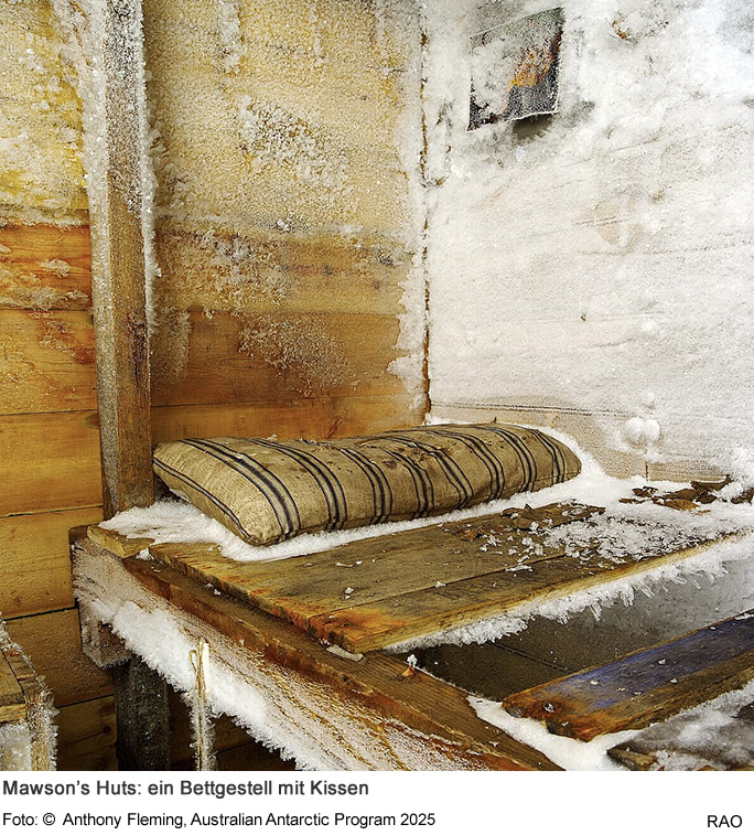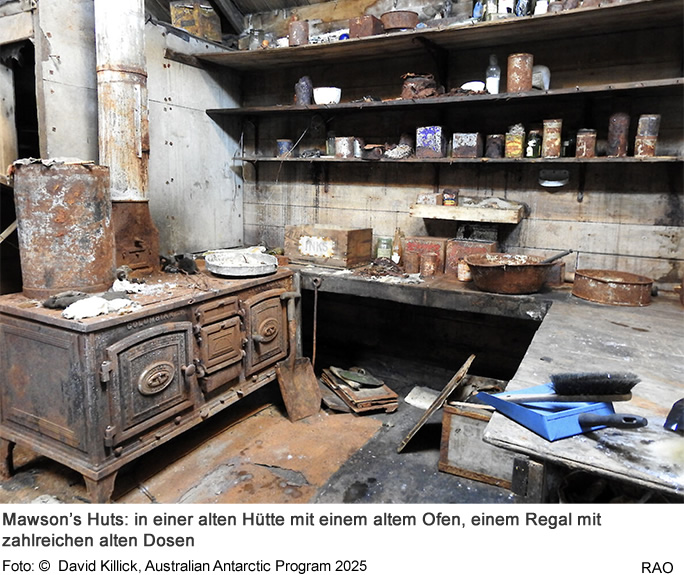 In den Hütten, welche die Australische Antarktis-Expedition von 1911 bis 1916 unter der Leitung des Geologen und Forschers Douglas Mawson 1912 am Kap Denison errichtet wurden, befinden sich Mobiliar und Gegenstände im Originalzustand. Douglas Mawson wurde später vom britischen König zum Ritter geschlagen und wurde so zum zum Sir Douglas Mawson. In der nahezu unberührten Landschaft in der Umgebung liegen noch Gegenstände, Geräte und Artefakte aus der historischen Expeditionszeit.