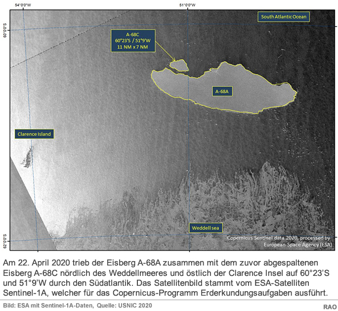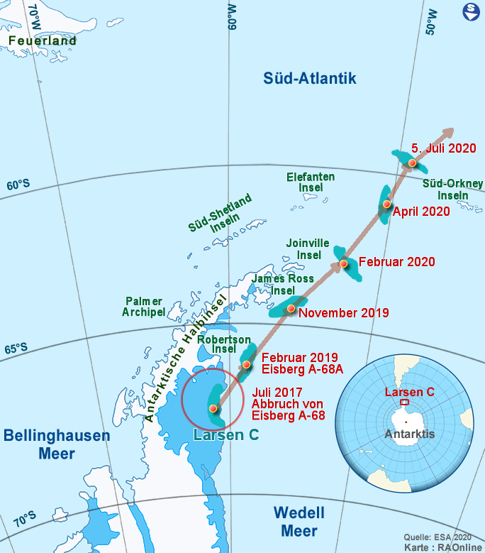 Am 5. Juli 2020 befand sich der Eisberg A-68A rund 1'050 km von seinem "Geburtsort" entfernt knapp nördlich des 60°S-Breitenkreises westnordwestlich der Süd-Orkney Inseln in den offenen Gewässern des Südatlantiks. Noch im April 2020 befand sich der Eisberg zwischen den Elefanten-Insel und der Süd-Orkney Inseln südlich des 60°S-Breitenkreises.