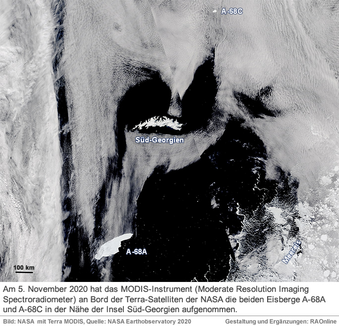 Am 5. November 2020 hat das MODIS-Instrument (Moderate Resolution Imaging Spectroradiometer) an Bord der Terra-Satelliten der NASA beiden Eisberge A-68A und A-68C in der Nähe der Insel Süd-Georgien aufgenommen. Die beiden Eisberge schwammen im April 2020 nahe beieinander durch den Südlichen Ozean. Im November 2020 hatte der kleinere A-68C rund 1'100 km Vorsprung auf das grössere Bruchstück A-68A. A-68C entfernte sich in dieser Zeit jeden Tag rund 5 km weiter von A-68A. Der Eisberg A-68C wird immer kleiner und kleiner. Bald wird A-68C auf den Satellitenbildern nicht mehr erkennbar sein.
