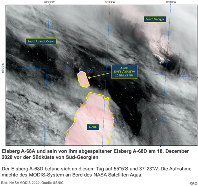 Am 18. Dezember 2020 brach der Eisberg A-68D vom Eisberg A-68A ab. Der Eisberg A-68A begann sich im Uhrzeigersinn zu drehen. In den folgenden Tage bewegte sich der Eisberg mit Meeresströmung südostwärts und entfernte sich von Süd-Georgien.