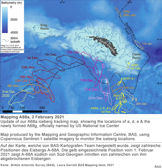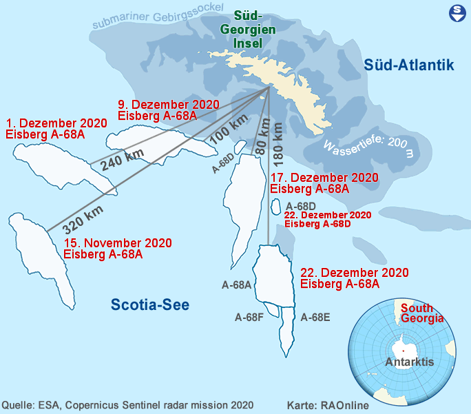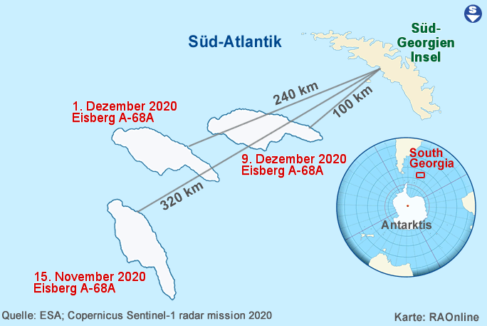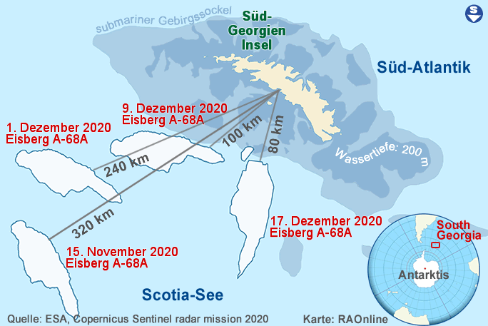 | Am 9. November 2020 befand sich der Eisberg A-68A nach Angaben der ESA noch rund 100 km südwestlich von Süd-Georgien. Die Auswertung von Daten der Erdbeobachtungssatelliten Sentinel-1 und Sentinel-3 zeigten, dass der Eisberg A-68A seit dem 1. Dezember 2020 mehr als 100 km nach Osten in Richtung der Insel Süd-Georgien geschwommen ist. Eine Kollision mit der Insel ist weiterhin möglich. Der der Insel vorgelagerte Meeresboden steigt aus einer Tiefe von rund 200 langsam gegen die Küste hin an. |