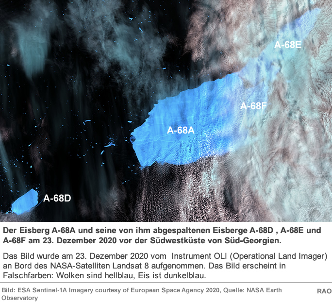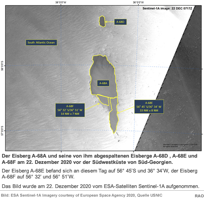| Am 22. Dezember 2020 meldete das U.S. National Ice Center den Abbruch der Eisberge A-68E und A-68F. Der ESA-Satellit Sentinel-1A hat am 22. Dezember den Eisberg A-68A und seine von ihm abgebrochenen Eisberge A-68D, A-68E und A-68F im Bild festgehalten.