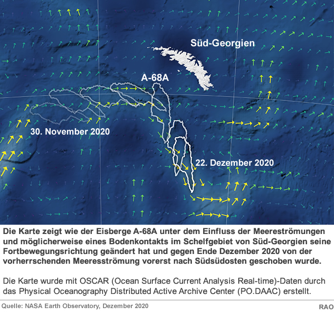 | Mitte Dezember 2020 traf der Eisgigant A-68A möglicherweise auf die Schelfzone von Süd-Georgien. Einen direkten Beweis für diese Kollisionsvermutung gibt es bisher nicht. Allerdings nährte das Verhalten des Eisbergs ab Mitte Dezember 2020 diese Zusammenstossvermutung.