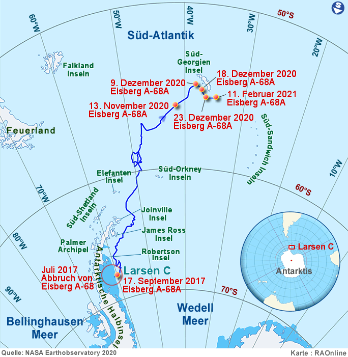 Seit seinem Abbruch vom Larsen-C Schelfeis im antarktischen Winter 2017 vor etwas mehr als 3 Jahren ist der Eisberg A-68-A auf einem für Eisberge dieser Abbruchregion üblichen Weg nach Norden in die «Iceberg Alley» (die Eisberg-Allee) gedriftet. Mehr als 90% dieser Eisberge verfolgen diesen Weg hinaus aus dem Weddell-Meer und hinein in den Südlichen Ozean.