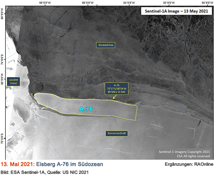 Das USA National Ice Center (USNIC) hat bestätigt, dass sich der Eisberg A76 aus dem Ronne-Schelfeis gelöst hat. Am 13. Mai 2021 befand sich der neue Eisberg A-76 bei 75° 17' Süd, 58° 54' West. Der Eisberg ist maximal 165 km lang und 26 km breit.