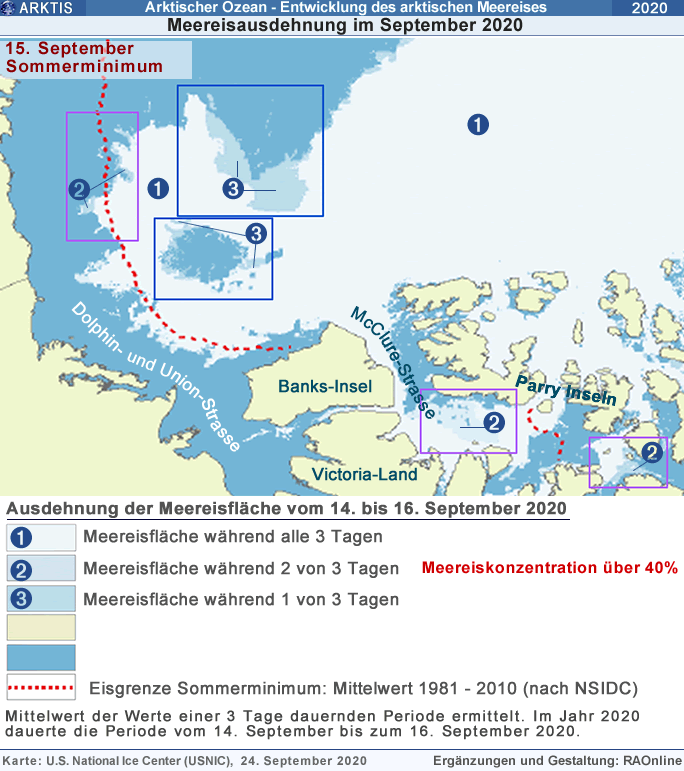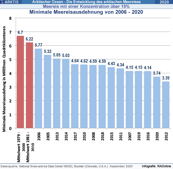 Das National Snow and Ice Data Center (NSIDC) ermittelte für den 15. September 2020 eine minimale Meereisflächevon 3,74 Millionen km2 in der Arktis.