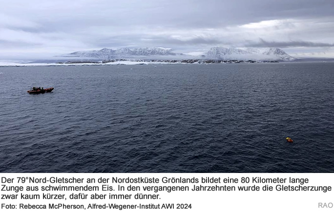 Der Nioghalvfjerdsfjorden-Gletscher- auch bekannt als 79°Nord-Gletscher- an der Nordostküste Grönlands fliesst direkt in einen Fjord und bildet dort eine 80 Kilometer lange Zunge aus schwimmendem Eis. In den vergangenen Jahrzehnten wurde die Gletscherzunge zwar kaum kürzer, dafür aber immer dünner.