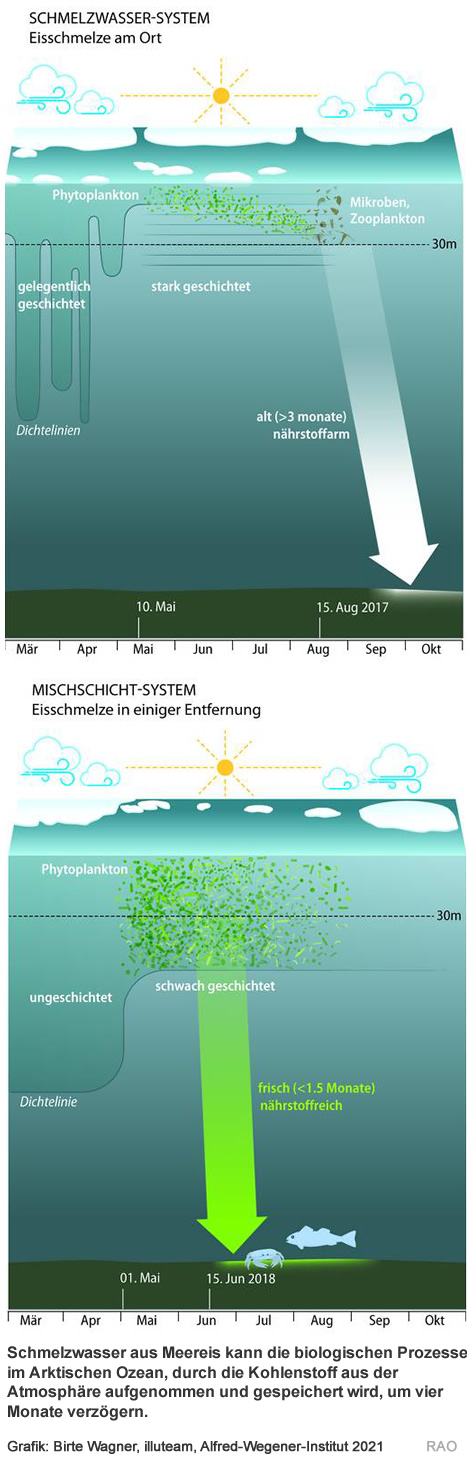 Ozeane gehören zu den grössten Kohlenstoffsenken unseres Planeten. Dazu trägt auch die biologische Kohlenstoffpumpe bei: Dicht unter der Wasseroberfläche nehmen Mikroorganismen wie Algen oder Phytoplankton Kohlendioxid aus der Atmosphäre durch Fotosynthese auf. Sinken sie auf den Meeresboden, kann dieser den enthaltenen Kohlenstoff für mehrere tausend Jahre speichern. Dass Schmelzwasser aus Meereisschollen diese Prozesse um vier Monate verzögert, konnten nun Wissenschaftlerinnen und Wissenschaftler des Alfred-Wegener-Instituts, Helmholtz-Zentrum für Polar- und Meeresforschung (AWI) feststellen.