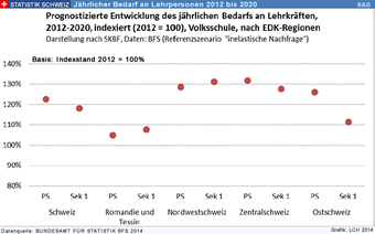Im Bildungsbericht wird auf die Mangelsituation hingewiesen: "Unter Berücksichtigung der Entwicklung der Schülerbestände, der Altersstruktur im Lehrkörper und der pensengewichteten Fluktuationsrate, ermittelt das BFS schweizweit für die Jahre 2012 bis 2020 einen Anstieg des jährlichen Rekrutierungsbedarfs an Lehrkräften auf der Primarstufe von 6 % bis 40 %. […] Da sich sowohl die altersmässige Zusammensetzung im Lehrkörper als auch die Schülerzahlen regional sehr verschieden entwickeln, resultiert ein nach Region ebenso unterschiedlicher Rekrutierungsbedarf." (Bildungsbericht Schweiz 2014, S. 231).